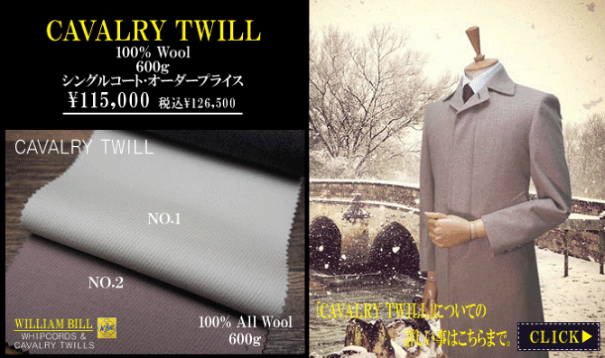 | 「キャバリーツイル」とは?「キャバルリーツイル」とも言う。生地の表面の畝(うね)がはっきり立ったギャバジンに似た独特の綾織物です。”トリコチン”の別名もある。生地の写真をご覧になってみるとわかりますが強い2本の細い畝で一本の綾目になっているので「二重畝ギャバジン」の名もあります。張り・コシがありウェイトは600g以上もあるので耐久性豊か、丈夫で伸縮性がありますのでパンツの単品や“オーバーコート地”。乗馬ズボンやゴルフパンツ等のアウトドア・スポーツに必須な抜群の耐久性を備えています。名前の由来は第一次世界大戦時にこの生地で英国士官の乗馬用パンツを作ったことから「キャバルリー・ツイル(騎兵隊のツイル)と呼ばれるようになりました。丈夫でそして味のあるこのマテリアル。最近流行のヘヴィーウェイトでのファブリックの代表選手です。保温性も抜群なのでスポーティーなスーツやジャケットも良いけれど。特に“トップコート”として「ステンカラーコート」「カバートコート」としても最適です。「ウィリアムビル」「キャバルリーツイル(キャバリーツイル)」のヘヴィーウェイトで「ガツン」とくる、しっかりとしたハリのあるファブリックでオーダーコートはいかがでしょうか。 |