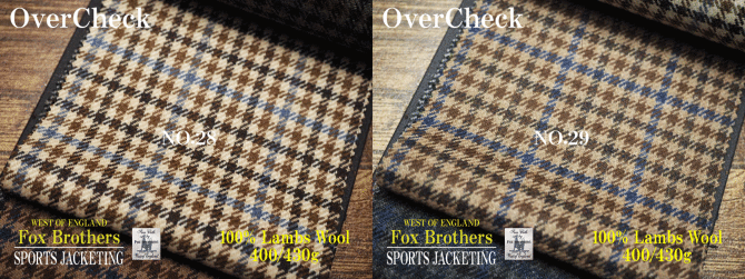 チェックの上に大きなチェックを重ねた柄のことで、「オーバーブレイド」「越格子(こしごうし)」とも言う。グレンチェックに大きなウィンドーペインを重ねた格子柄。「フォックス」社も現代的に多色の綺麗なカラーを入れて組み合わせたチェックパターンなのでカントリージャケット風からタウンジャケット風にも最適なチェックパターンです。 |