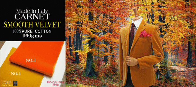| 「カルネ」「ベルベットジャケット」「ベルベットスーツ」コレクション「スムースベルベット」。ベルベットとは和名でビロードと言います。羽毛のような柔らかな手触りの毛羽立ちと上品な光沢感を放つ、フォーマルを代表する素材です。なんといっても「ベルベットジャケット」「ベルベットスーツ」は「カジュアル」はもちろんのこと、「フォーマルウェアー」にも最適で「ブライダルウェアー」の時は男性側の、フォーマルスーツや「タキシード」になさっても最高の素材。以前までは「ベルベットスーツ」や「ベルベットジャケット」に使われるベルベットは古くからあこがれの高級品だった事もあり、懐古的(ノスタルジック)な意味合いや和服地、シルクベルベットには「ビロード」の言葉が使われることが多いのです。また広義には別珍(べっちん)も含めてビロードと呼ばれます。織物の表面に毛羽やループを特徴とするパイル織りの一種ですね。 ベルベットはその独特の柔らかい暖かみのある肌触りと優雅な光沢でフォーマルウェアの素材として古くから重宝されてきました。 ベルベットの中で、どのベルベットよりもイタリアンらしく綺麗でどこか上品さを漂い、肌触りの滑らかな「ベルベットジャケット」「ベルベットスーツ」には最高の商品です。全23色とカラーパレットの豊富さは世界を誇ります。ベルベットのスーツを着てお友達の結婚式(ウェディング・ブライダル・フォーマルウェア-)やパーティー、その他のイベントにいきましょうか。男性でも女性でも大学のキャンパス内で着てもとってもお洒落なジャケットになり、みんなの渇望のまなざしになりますよ。 |