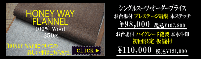 | 「フラッテリ・タリア・ディ・デルフィノ」が渾身込めて発表したのが「HONEY WAY(ハニーウェイ」コレクション。ウェイトが350gmsのやや重めの紡毛フランネルで、環境に優しいミツバチの蜜蝋(みつろう)を使った新開発のフィニッシュが施されているので滑らかでソフトなタッチに仕上がりました。とろけるような極上の着心地で、着ていることを忘れさせるような軽量スーツ地。もちろん蜜蝋は天然素材なので環境負担も少ない、オーガニック素材です。「フランネルジャケット」としてカジュアルにも着こなせる応用範囲の広いチェック柄をご用意しております。 |